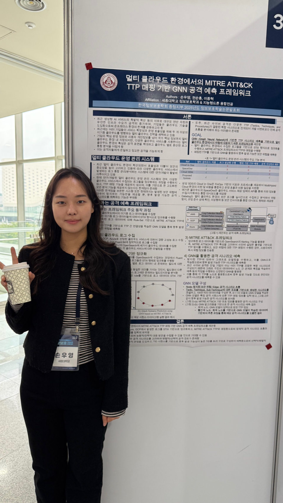 손우영 학생은 권순홍 학생과 함께 “멀티 클라우드 환경에서의 MITRE ATT&CK TTP 매핑 기반 GNN 공격 예측 프레임워크” 논문을 제출하여 발표하였습니다.
