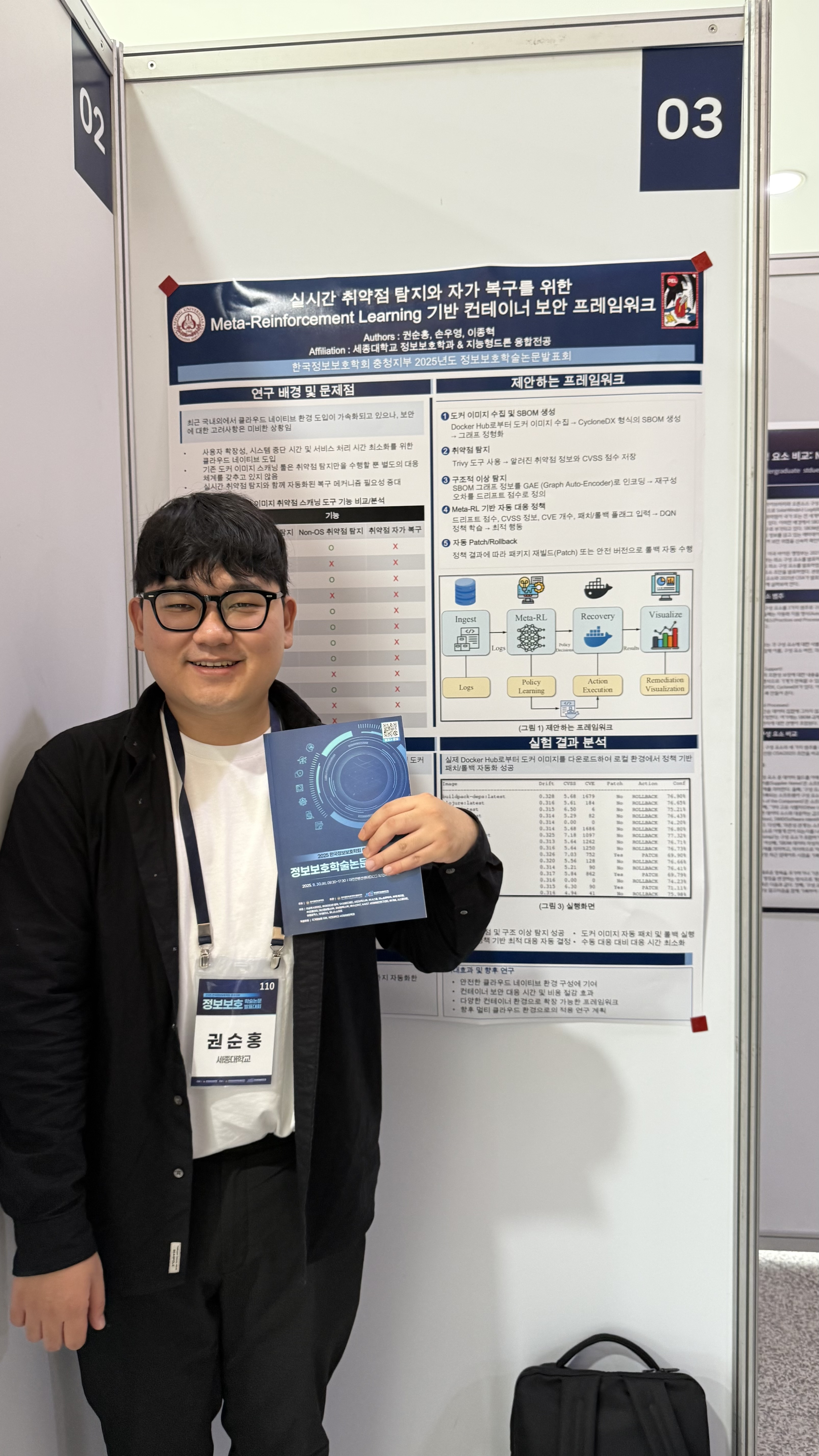 권순홍 학생은 손우영 학생과 함께 “실시간 취약점 탐지와 자가 복구를 위한 Meta-Reinforcement Learning 기반 컨테이너 보안 프레임워크” 논문을 제출하여 발표하였습니다.