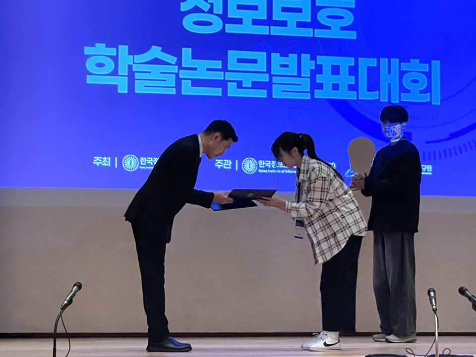 이 날, 송민희 학생은 정보보호학회 충청지부 학술대회에서 우수논문상을 수상하였습니다. 축하합니다!