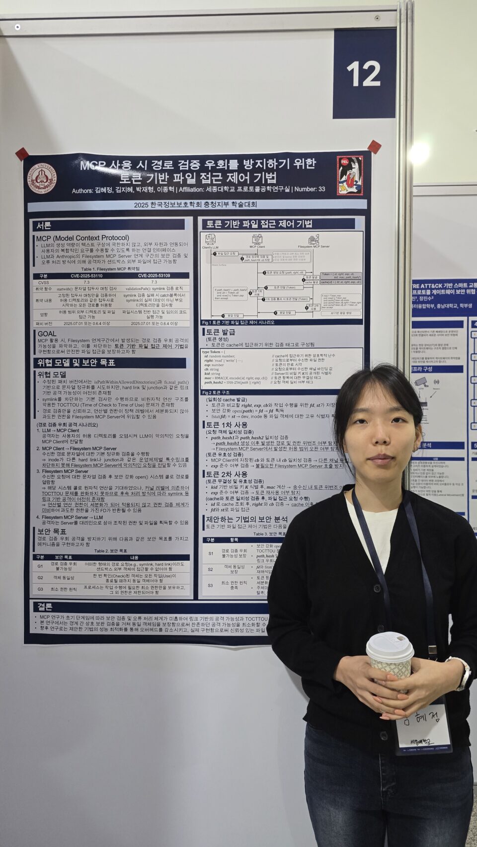 김혜정 학생은 김지혜, 박재형 학생과 함께 “MCP 사용 시 경로 검증 우회를 방지하기 위한 토큰 기반 파일 접근 제어 기법” 논문을 제출하여 발표하였습니다.