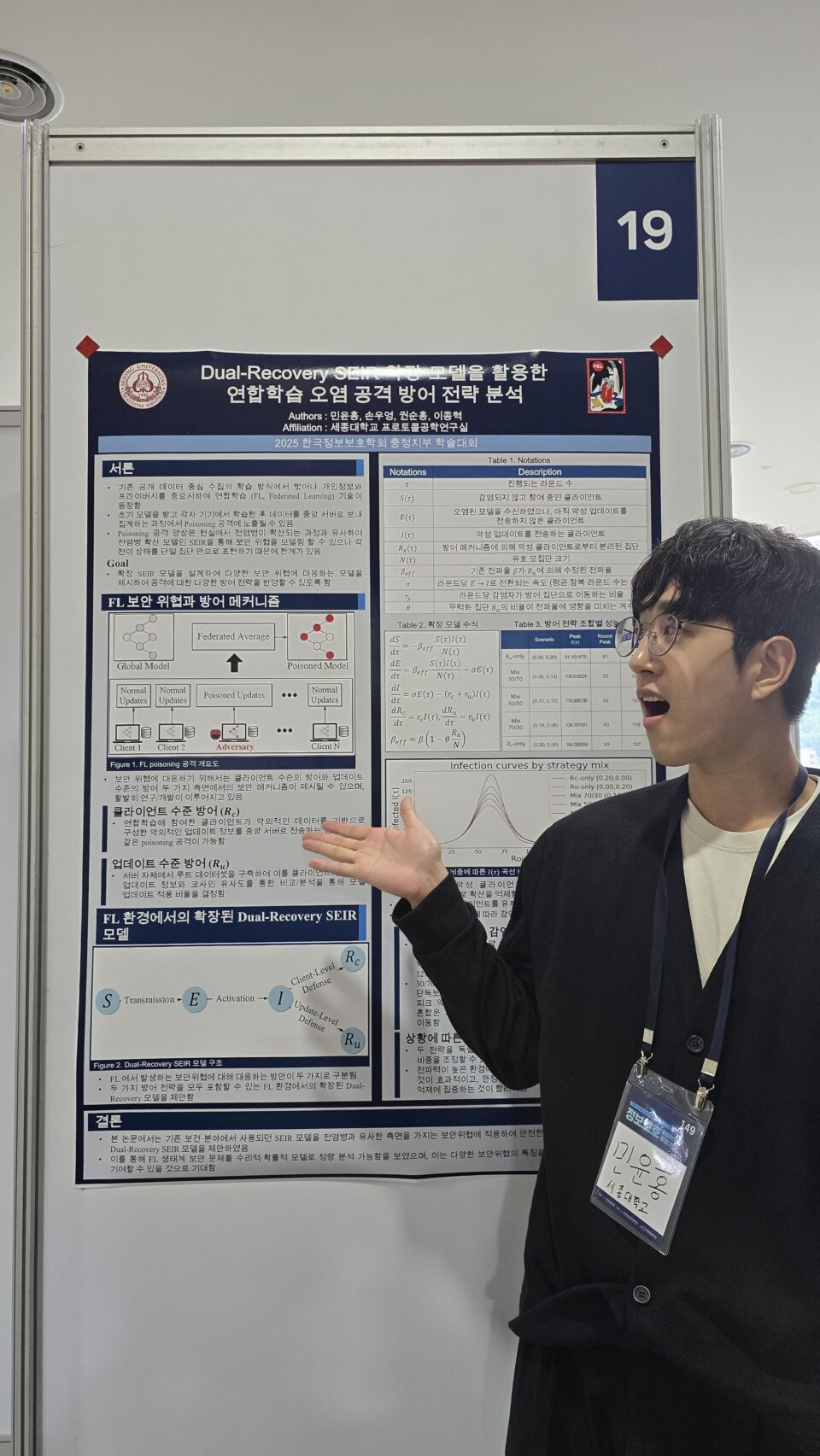 민윤홍 학생은 손우영, 권순홍 학생과 함께 “Dual-Recovery SEIR 확장 모델을 활용한 연합학습 오염 공격 방어 전략 분석” 논문을 제출하여 발표하였습니다.