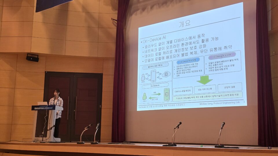 송민희 학생은 박재형, 우승찬 학생과 함께 “On-Device AI 모델 소유권 증명을 위한 워터마킹 프레임워크” 논문을 제출하여 발표하였습니다.