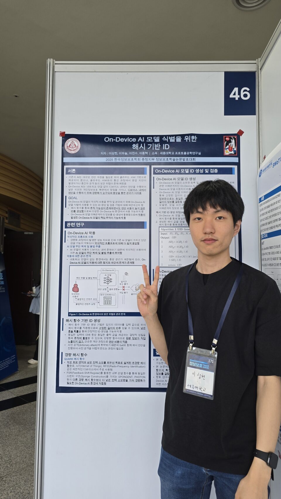 이성현 학생은 이하늘, 이진수 학생과 함께 “On-Device AI 모델 식별을 위한 해시 기반 ID” 논문을 제출하여 발표하였습니다.