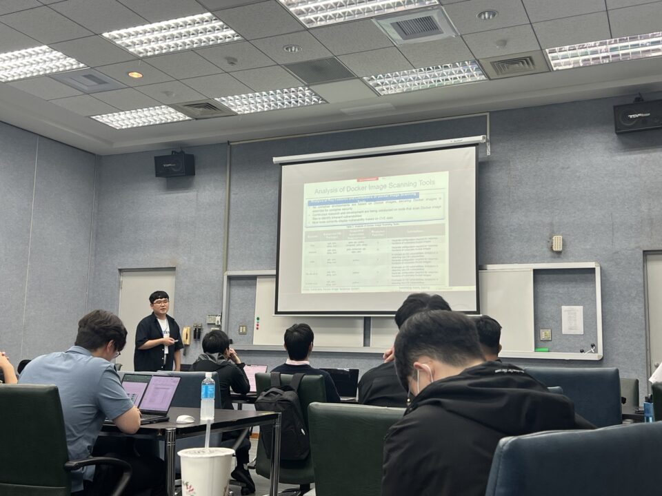 권순홍 학생은 “VDIRS: Vulnerable Docker Image Response System”을 주제로 발표를 진행하였습니다. 해당 논문은 효율적인 이동통신 서비스를 만들기 위한 연구와 보안 내재화를 위한 노력이 진행됨에도 불구하고 컨테이너를 대상으로 하는 보안 위협이 지속적으로 발생하고 있어 이를 해결하기 위해 SBOM(Software Bill of Materials)을 기반으로 도커 이미지의 취약점을 진단하고 취약한 도커 이미지에 대응하기 위한 시스템을 제안합니다.