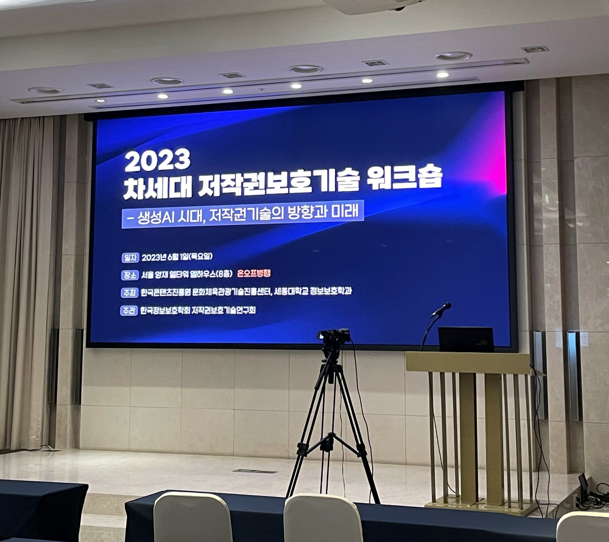 2023년 6월 1일(목), 서울 양재 엘타워에서 2023 차세대 저작권보호기술 워크숍이 개최되었습니다. 이번 워크숍에서는 저희 이종혁 교수님께서 조직위원장으로 자리를 빛내주셨고, PEL 학생들은 행사 진행을 도왔습니다.